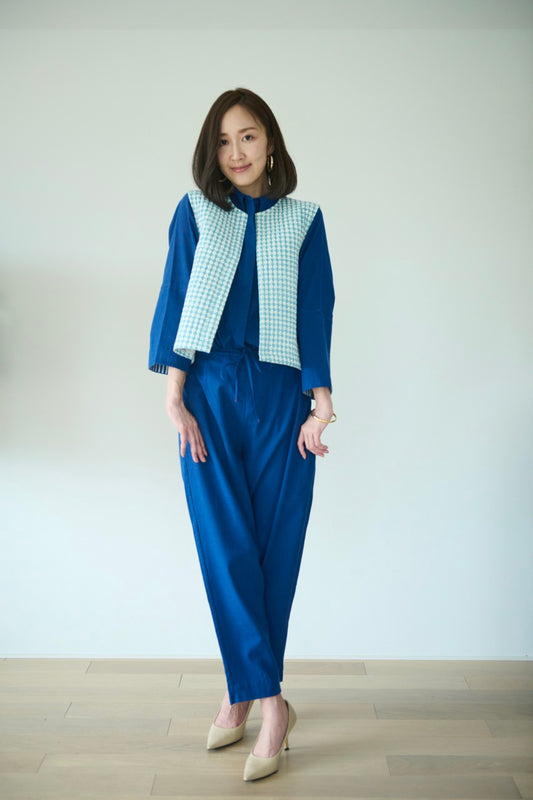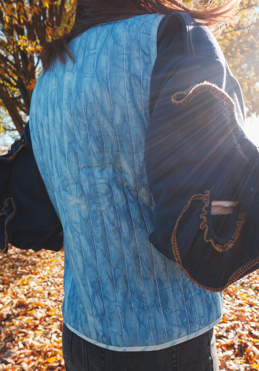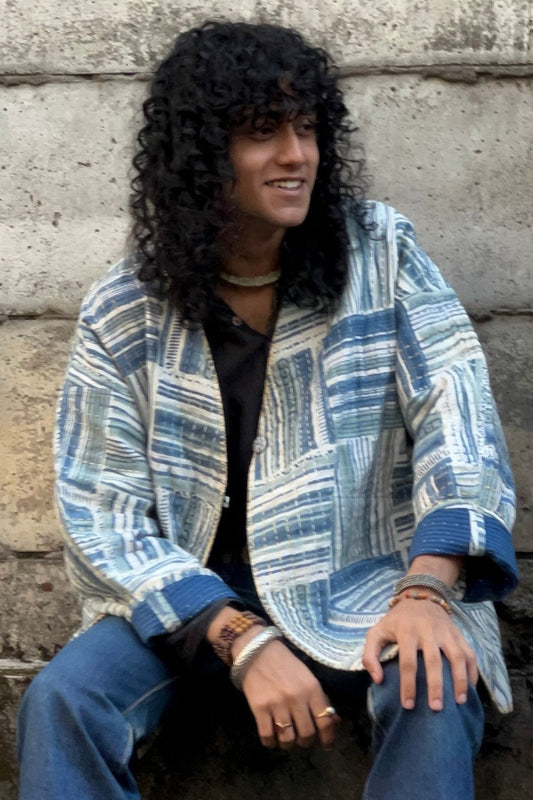 Free Falling Kantha Handblock Print Khadi Jacket Blue