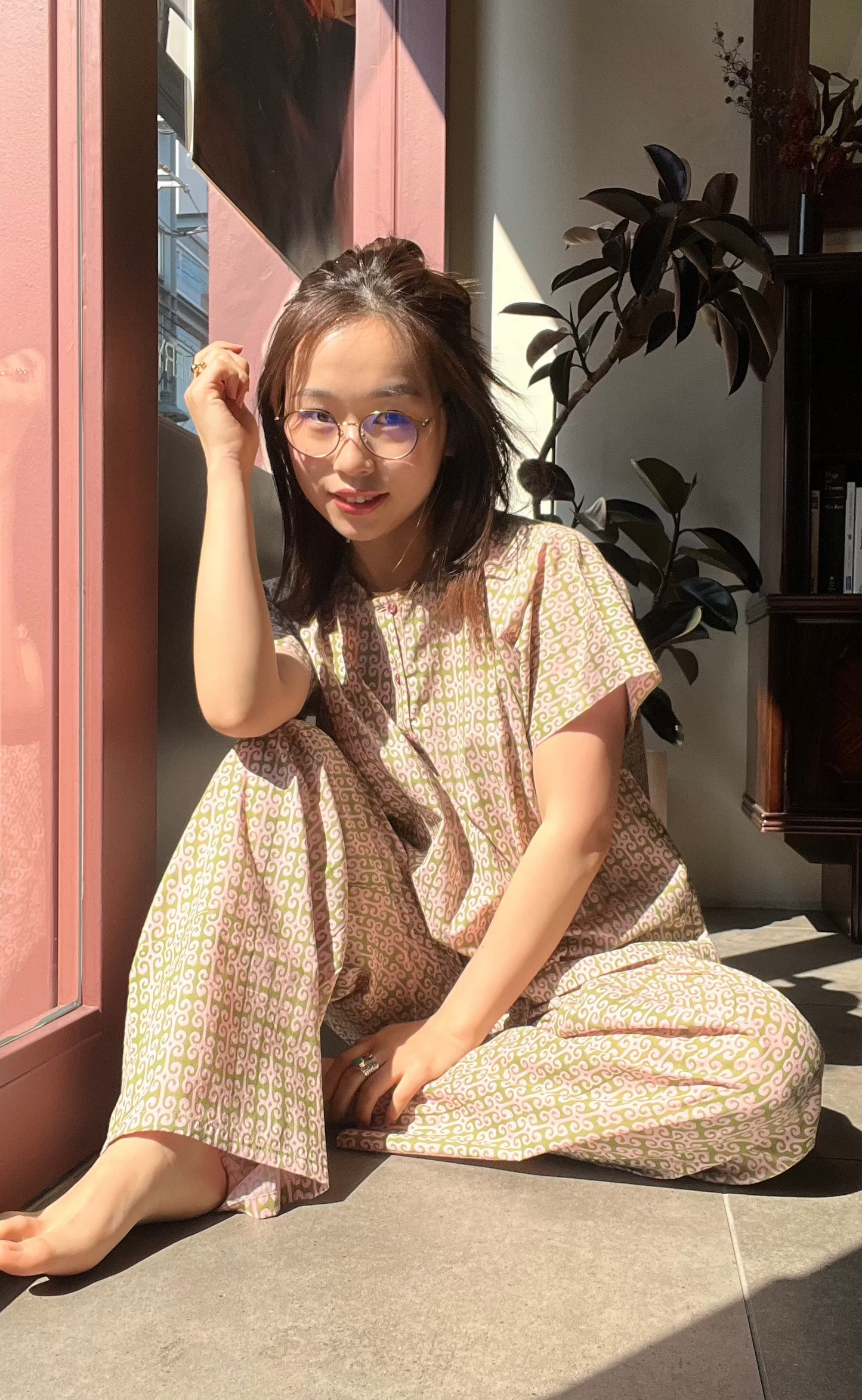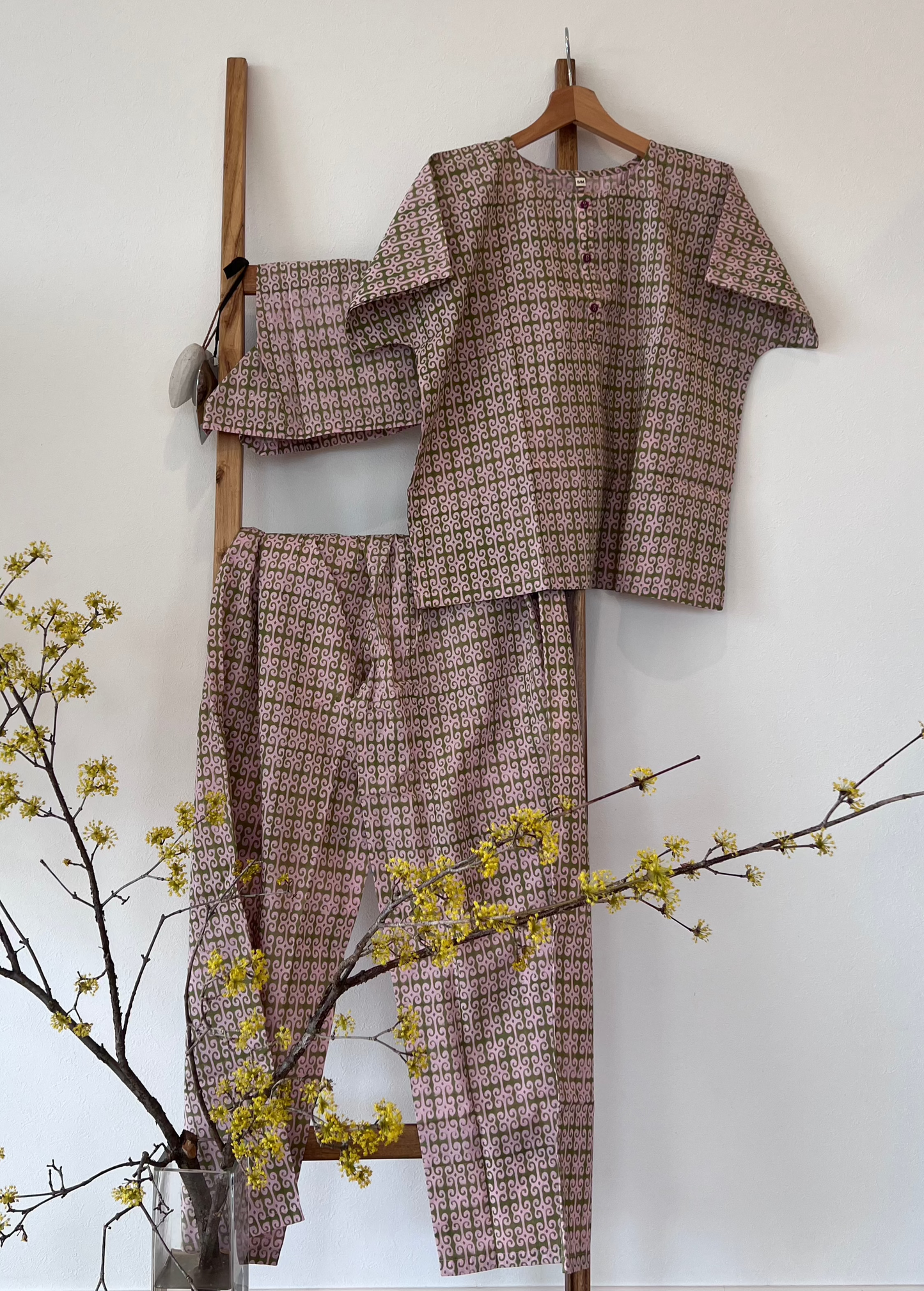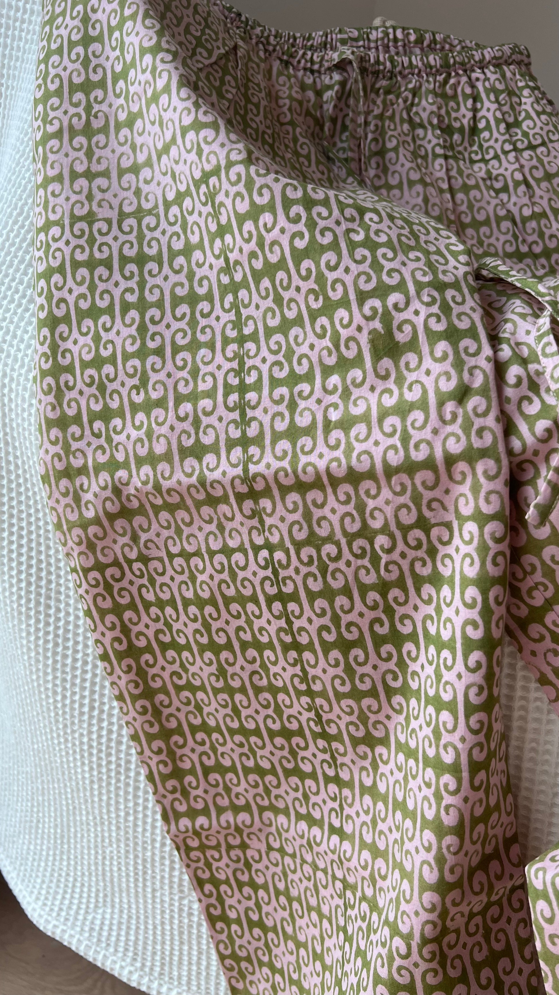A relaxed lounge set made with lightweight hand block printed cotton in a green and pink pattern. The top has contrasting buttons. The pants come with pockets and an elasticated waistband with drawstring.