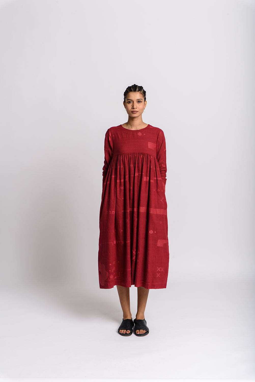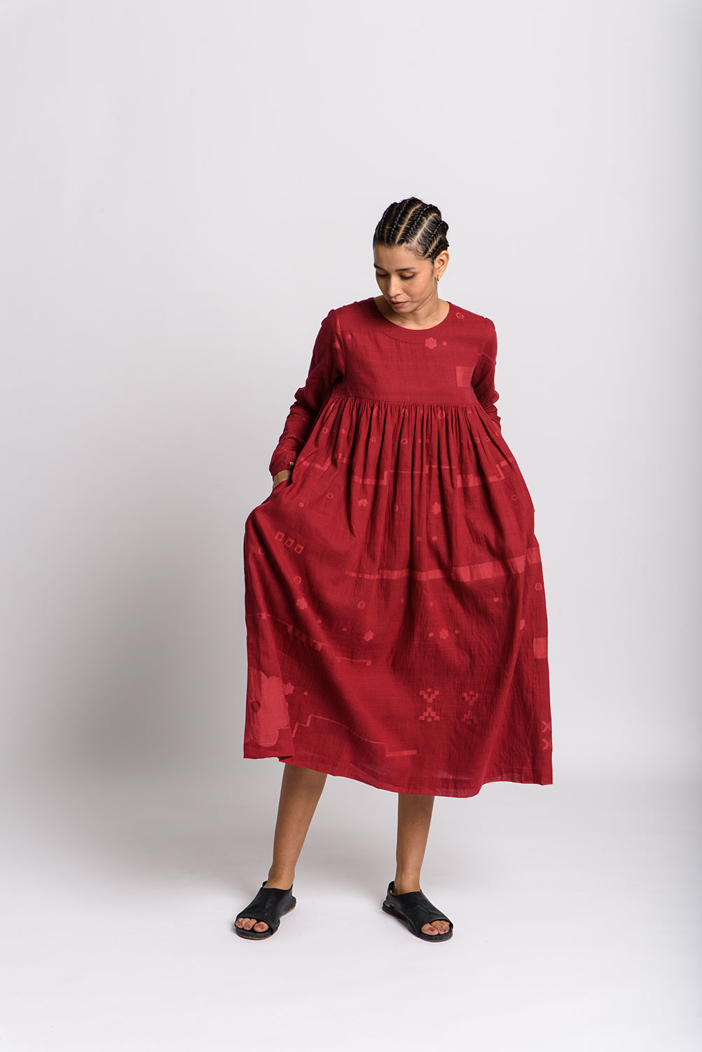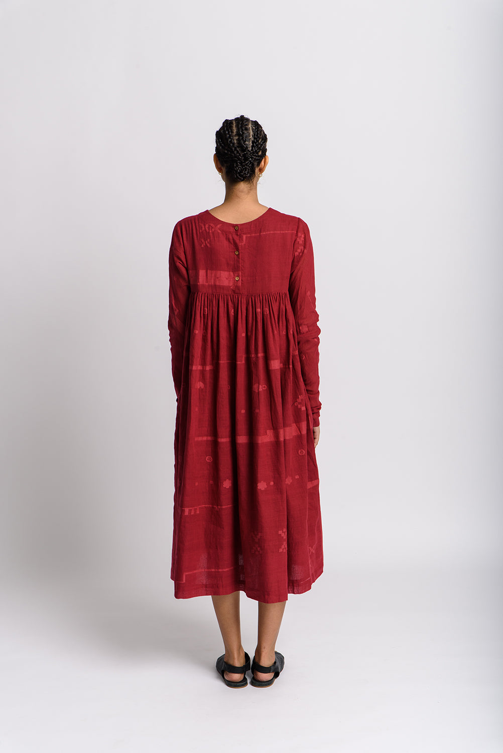 An elegant abstract jamdani dress with abstract weaving detail all over, a rounded neckline, gathers at the empire line, long sleeves that gather at the wrist, and button closure detail on the back.