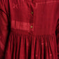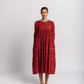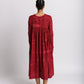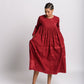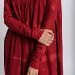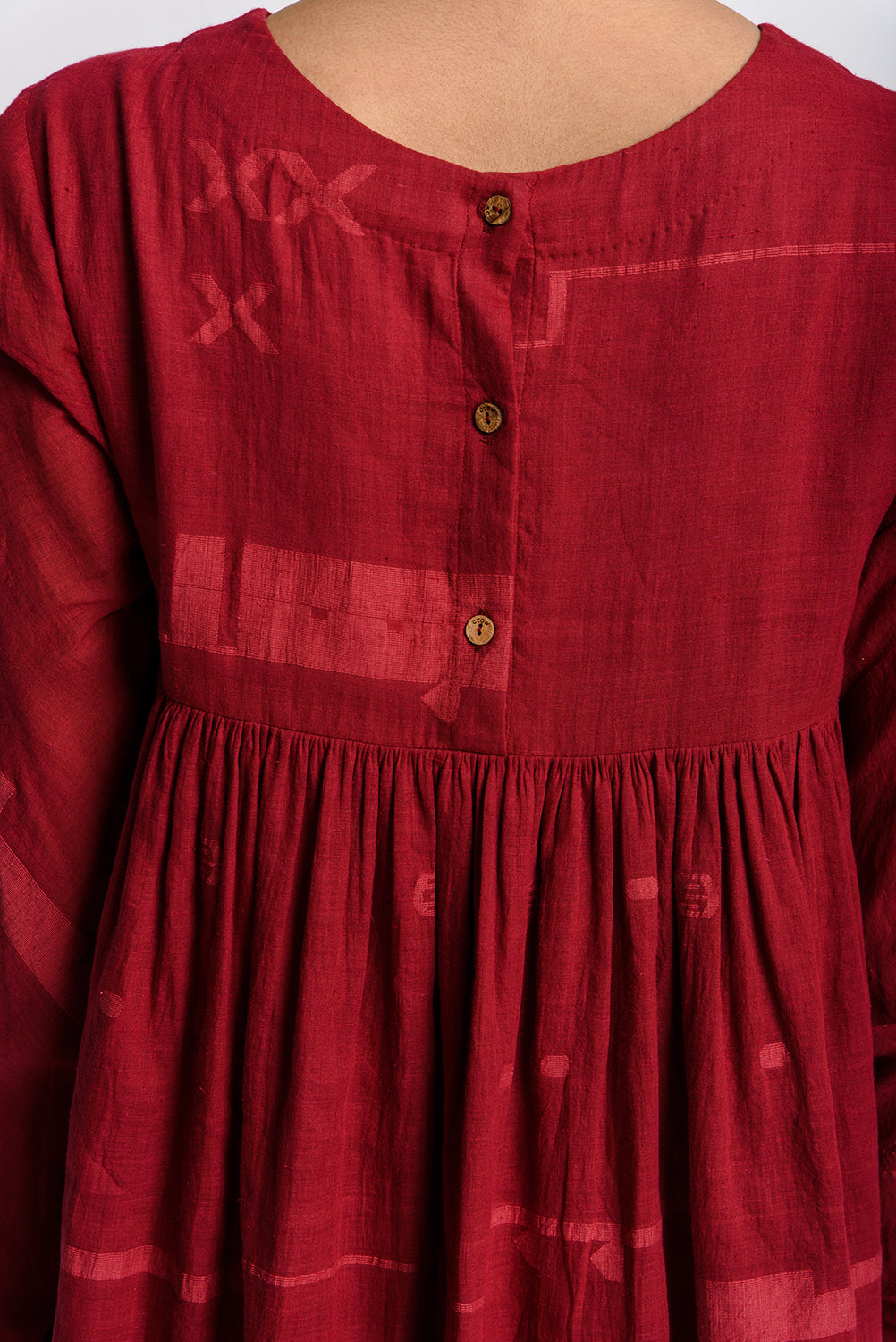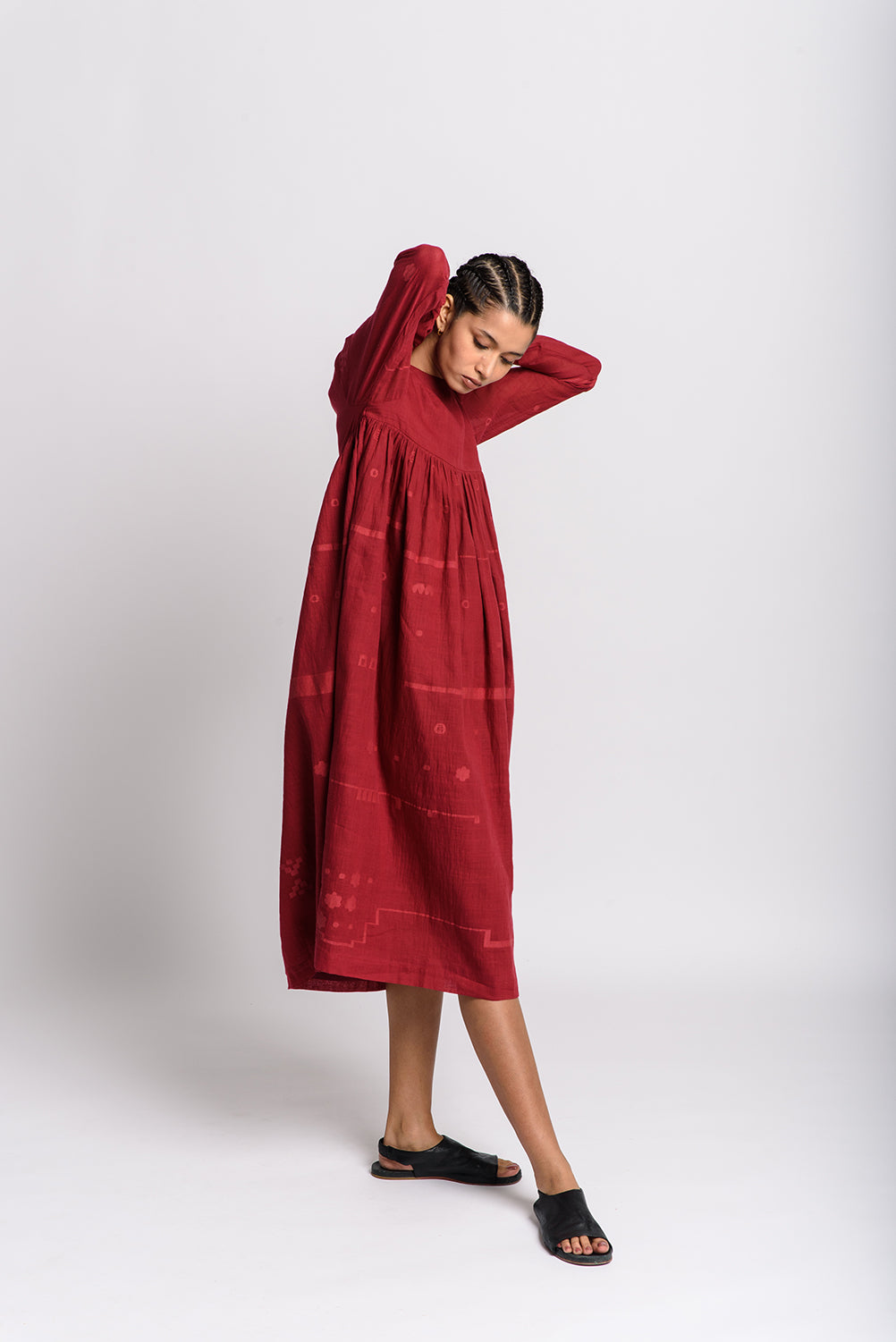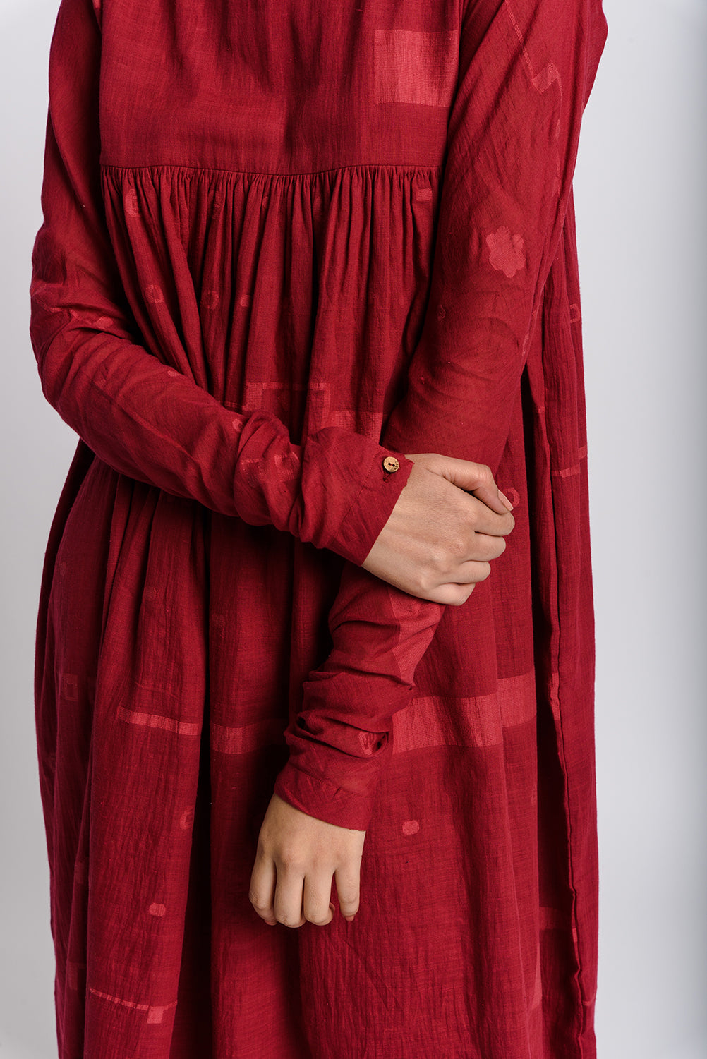 An elegant abstract jamdani dress with abstract weaving detail all over, a rounded neckline, gathers at the empire line, long sleeves that gather at the wrist, and button closure detail on the back.